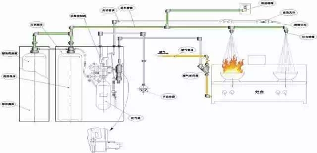 以往的廚房滅火系統(tǒng)是指針對廚房建筑物本身的滅火保護系統(tǒng),最常見的煙感、溫感探測系統(tǒng)和水噴淋系統(tǒng)等。由于廚房火災(zāi)多起因于灶臺用火失控,引燃集油煙罩和排煙管道內(nèi)的油垢釀成難以撲救的通天大火。因此,廚房的熱廚加工設(shè)備“灶臺、集油煙罩、排煙管道”就成為廚房內(nèi)的重點保護對象;而針對廚房熱廚加工設(shè)備實現(xiàn)“局部重點滅火保護”的系統(tǒng)稱為“廚房設(shè)備自動滅火裝置”,它與廚房滅火系統(tǒng)是保護對象不同的兩個互相獨立、互不干擾的滅火保護系統(tǒng)。